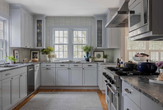 Die ganz in Weiß gehaltene Küche verblasst, da Hausbesitzer und Designer sich für mutigere Farbwahlen entscheiden. Arbeitsplatten aus dunklem Stein – darunter Marmor, Quarzit und Speckstein – gewinnen aufgrund ihrer Fähigkeit, Tiefe und Raffinesse zu verleihen, an Bedeutung. Kelsey McGregor weist darauf hin, dass kühle Grautöne eine Übergangsoption für diejenigen bieten, die gegenüber tiefem Schwarz zögerlich sind, sich aber dennoch von der rein weißen Ästhetik lösen.