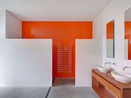 Червоний колір в інтер’єрі ванної кімнати, поєднаної з туалетом