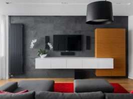 При установці телевізора слід продумати настінне кріплення або поворотний кронштейн, тумба з’їсть дорогоцінні метри і захарастить приміщення. Це ж стосується і акустичної системи, яку взагалі краще вбудувати в стелю або стіни.