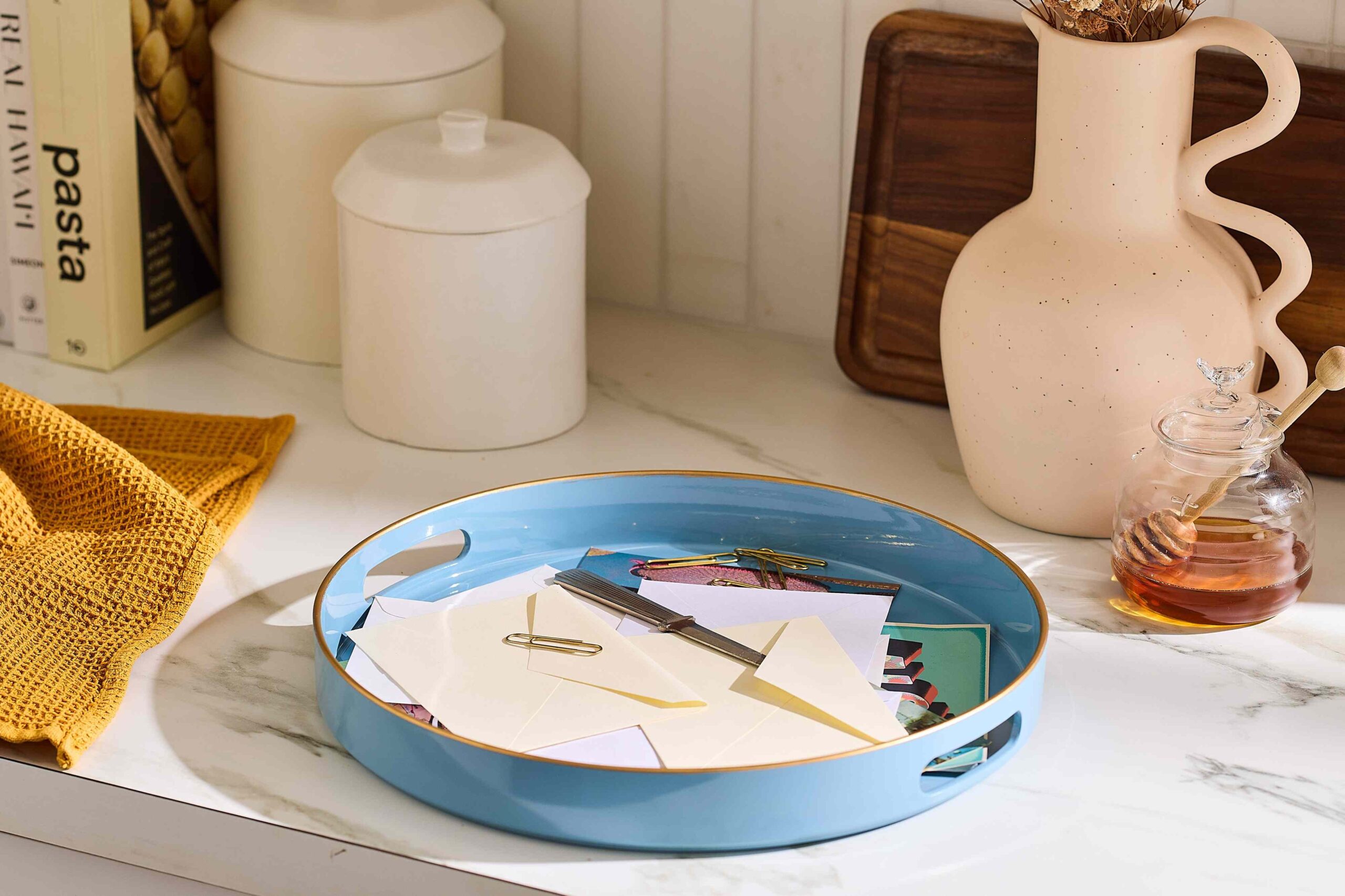 Po przygotowaniach do świątecznej kolacji wyczyść blaty kuchenne z drobnego sprzętu AGD – mikserów, blenderów, tosterów i frytkownic – aby zmniejszyć wizualny bałagan. Oczyszczone powierzchnie zapewniają miejsce na dekoracyjne tace lub sezonowy element centralny, poprawiając prezentację żywności i napojów.