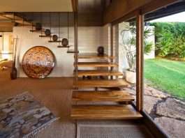 У невеликому котеджі, побудованому з дерева, чудово буде виглядати цілком дерев’яні сходи. Естетично – це одне з найкращих рішень. Дерево екологічно, до того ж гарно виглядає і додає будинку атмосферу затишку і тепла. Проте надмірно міцної таку конструкцію не назвеш.