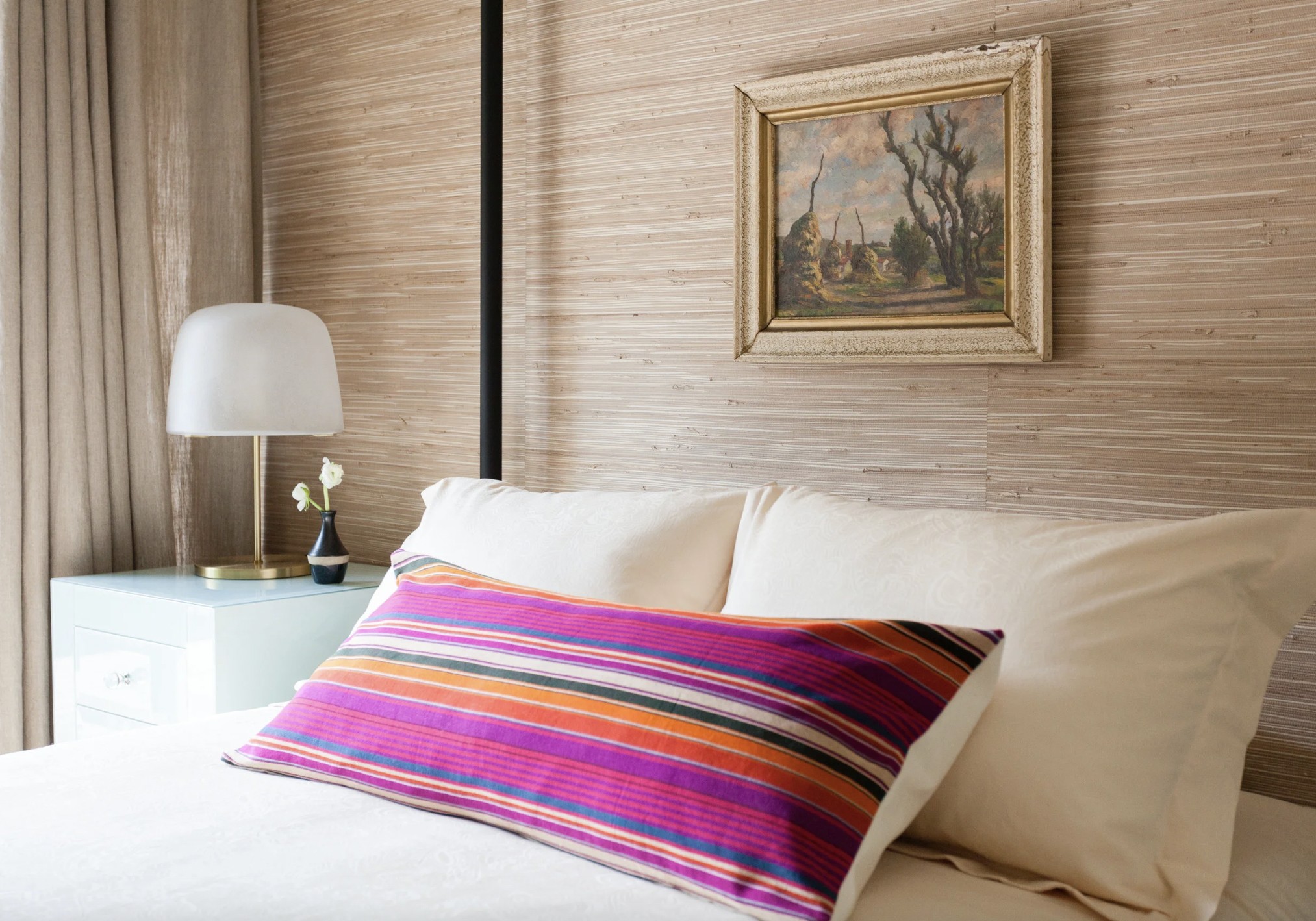 Хортон пропонує поєднувати циліндричну подушку з євро-подушкою (квадратною розміром 26 дюймів з кантиком) для додаткового лиску, але навіть одна циліндрична подушка значно впливає. Це також простий спосіб додати візерунок або текстуру до нейтральної схеми постільної білизни.