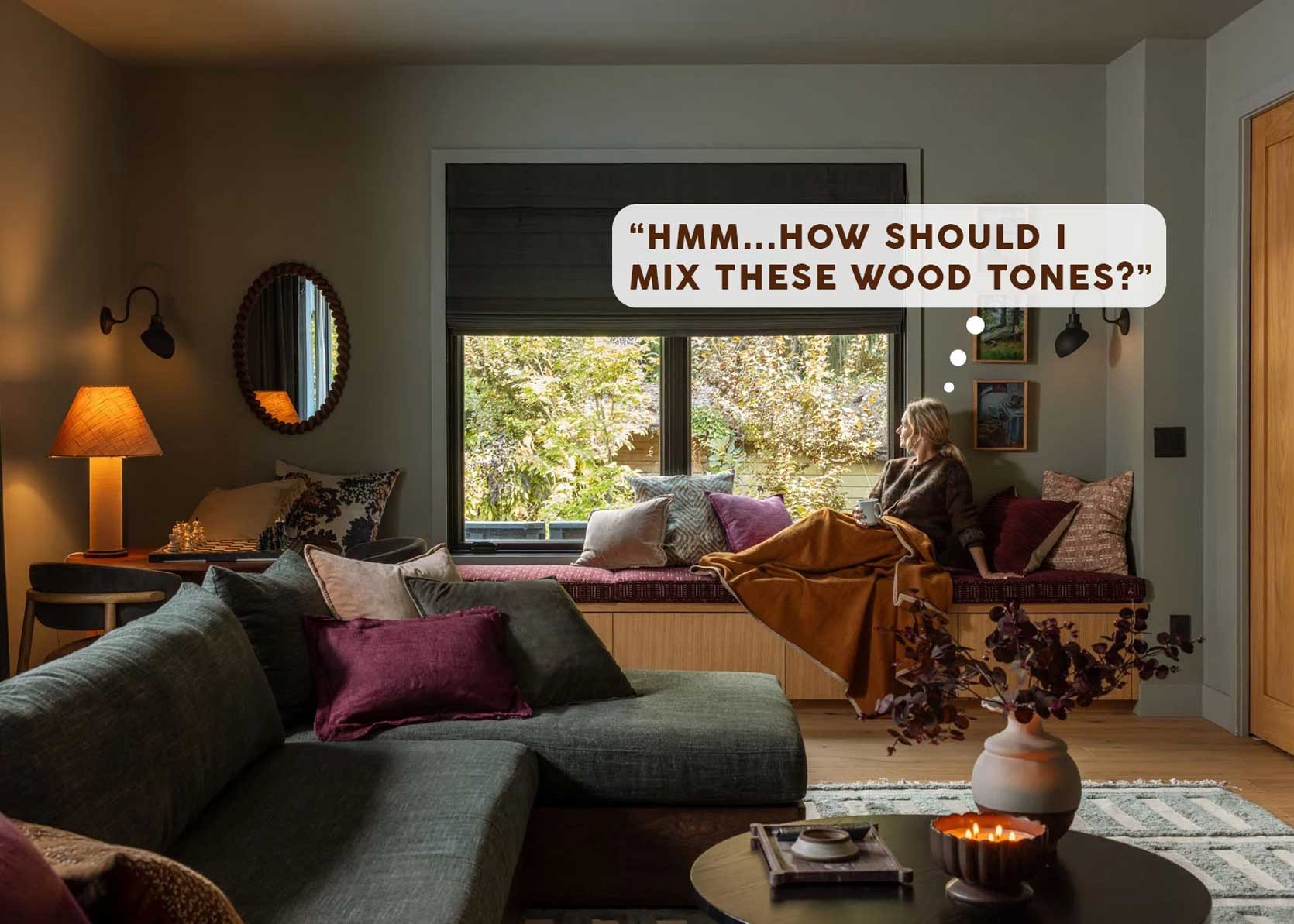 * Багатошарова Теплота: У вітальні, розробленій Емілі Хендерсон для свого брата, поєднуються горіх, деревина середніх тонів у меблях та пофарбовані шафи. Послідовність у теплоті пов’язує простір воєдино.