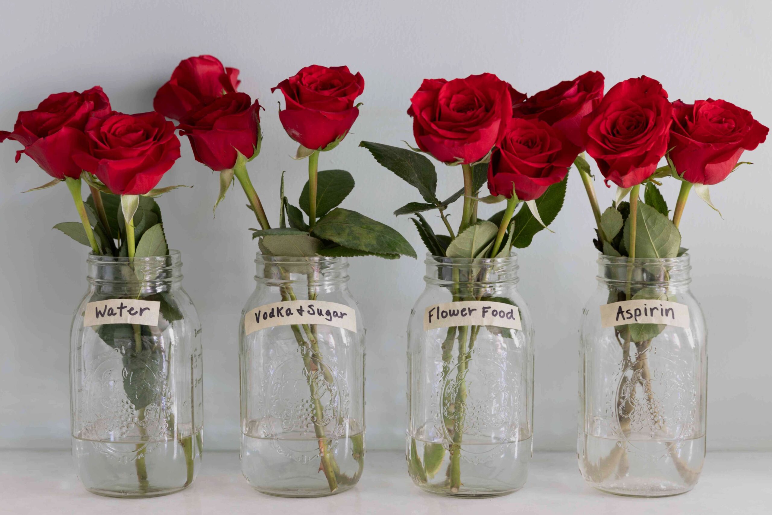 Експеримент полягав у поділі одного букета червоних троянд на чотири вази: контрольна група з чистою водою, одна з горілкою та цукром, інша з харчуванням для квітів та остання з подрібненим аспірином. Кожна ваза отримала однакову кількість води (240 мл), а розчини оновлювалися кожні два дні разом зі свіжим косим зрізом стебел.